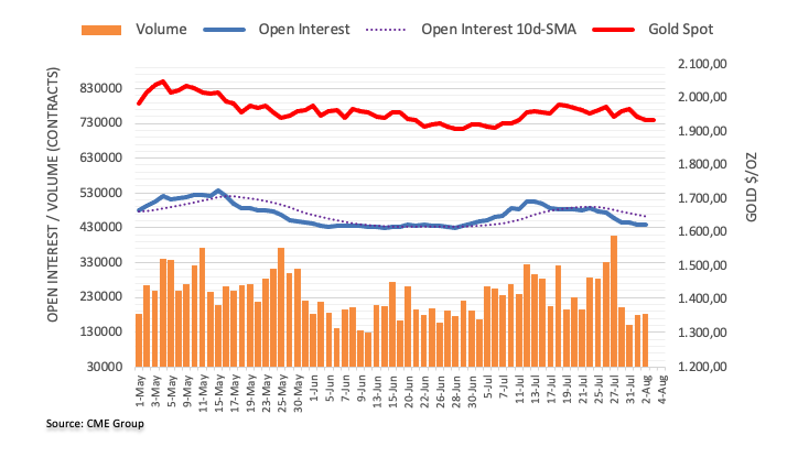 Wednesday’s downtick in gold prices was on the back of increasing open interest and volume, hinting at the idea that extra decline could be in the pipeline for the yellow metal in the very near term. Against that, the next support of note comes at the round level of $1900 per troy ounce prior to the June low of $1893 (June 29).
