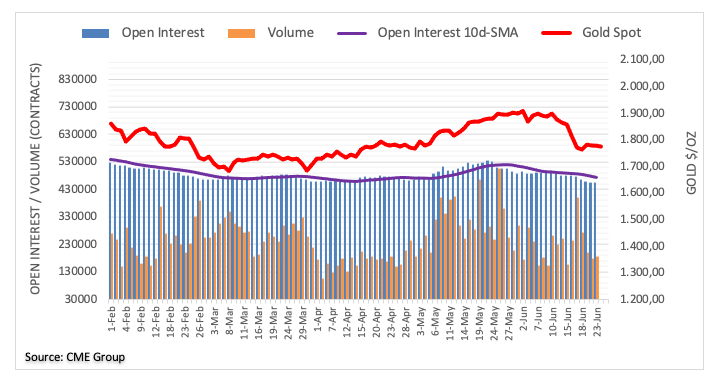 Open interest in gold futures markets rose by just 976 contracts for the first time since June 11 on Wednesday, according to preliminary readings from CME Group. In the same line, volume reversed three consecutive daily pullbacks and went up by around 7.7K contracts.
