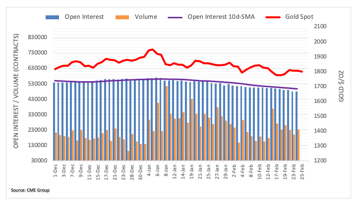 Gold prices charted an inconclusive session on Wednesday amidst rising open interest and volume, exposing the continuation of the consolidative mood at least in the very near-term. The resumption of the upside faces the next target of note around $1,850 per ounce, where coincide recent tops and the 200-day SMA.