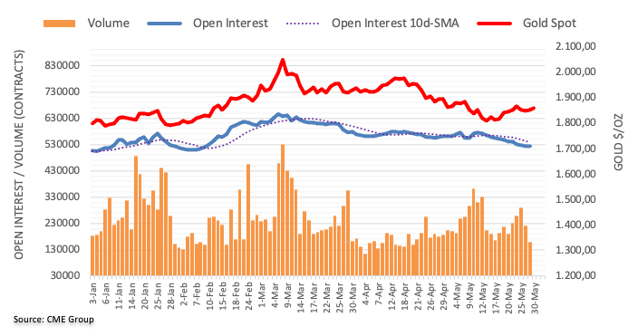 Friday’s small uptick in gold prices was amidst shrinking open interest and volume, leaving the prospects for extra gains somewhat diminished in the very near term. In the meantime, the precious metal appears well supported by the 200-day SMA around $1,840.