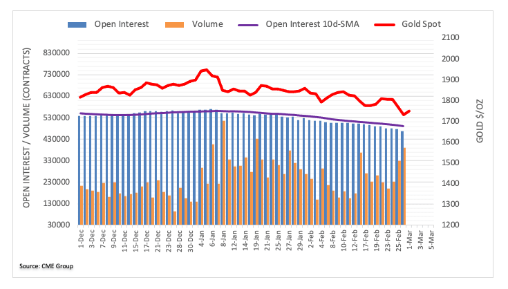 Open interest in gold futures markets shrunk for the second consecutive session on Friday, this time by around 8.8K contracts according to preliminary figures from CME Group. Volume, instead, went up for the third session in a row, now by around 60K contracts.