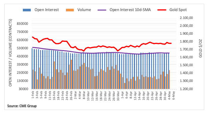 Gold prices briefly tested the $1,800 neighbourhood on Tuesday before closing the day in the negative territory. The downtick was on the back of shrinking open interest, leaving the prospects for extra downside diminished for the time being. In the meantime, the $1,800 mark per ounce troy remains the next target of note.