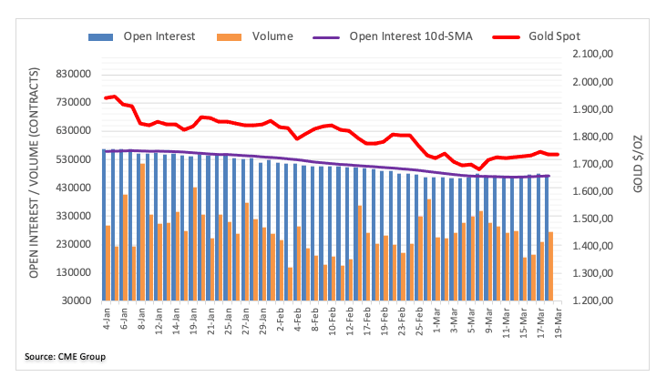 Open interest in Gold futures markets shrunk by around 3.1K contracts on Thursday, reversing three consecutive daily builds according to flash data from CME Group. Volume, instead, rose for the third session in a row, this time by around 34.3K contracts.