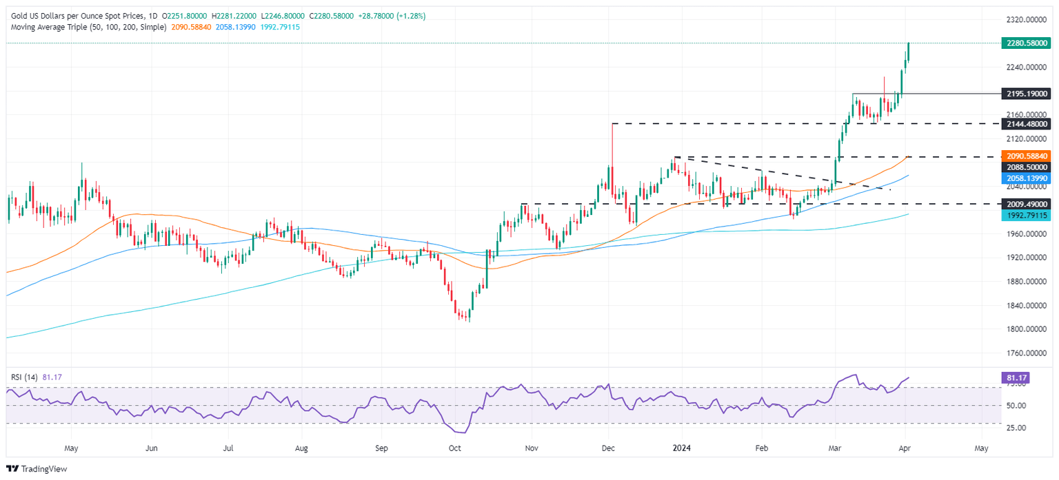 Gold price rallies to new all-time highs of $2,276 late in the North American session amid geopolitical risks and despite higher US Treasury yields. Economic data from the United States (US) prompted investors a flight to safe-haven assets, sending the yellow metal higher. At the time of writing XAU/USD exchanges hands at $2,280 gaining more than 1%.