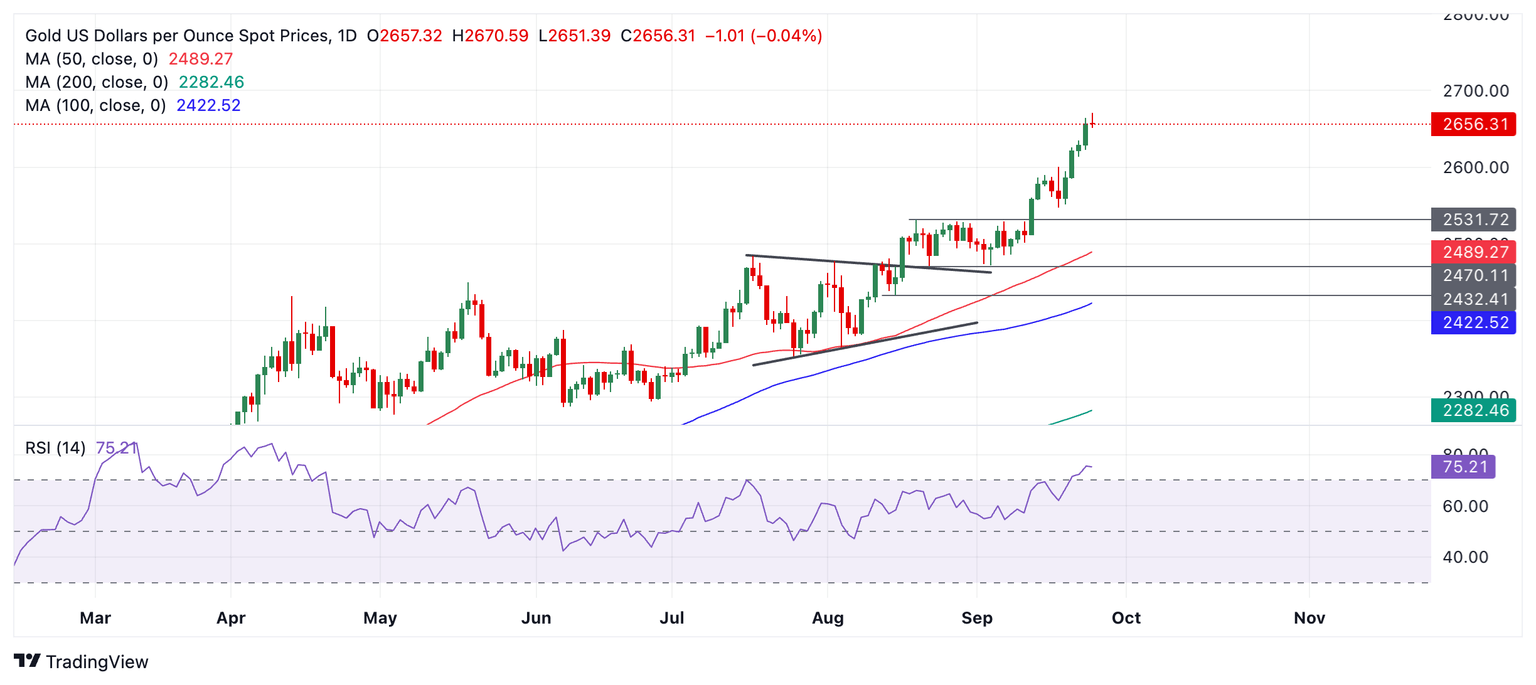 Gold (XAU/USD) rallies to another record high of $2.670 per troy ounce on Wednesday after an unexpected drop in US Consumer Confidence data on Tuesday increased bets of more aggressive easing and deeper interest rate cuts from the Federal Reserve (Fed).