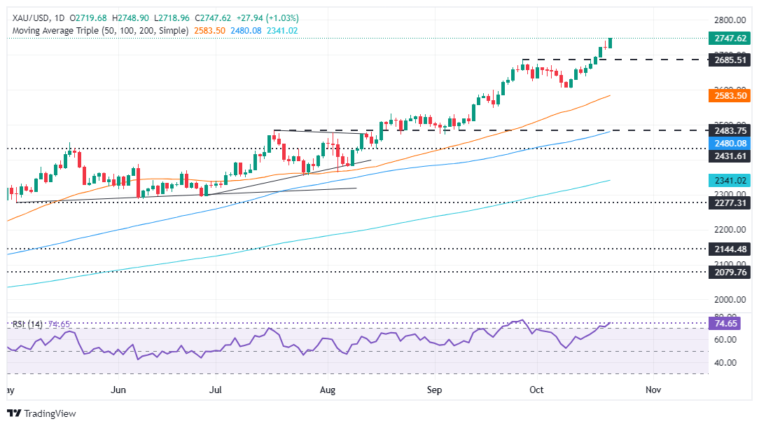 Gold prices extended their gains for the fifth day out of the last six and reached an all-time high (ATH) at $2,748, just shy of the psychological $2,750 mark. Geopolitical tensions and expectations that the Federal Reserve (Fed) would continue to lower borrowing costs are tailwinds for the yellow metal. Therefore, XAU/USD trades at $2,744, gaining almost 1%.