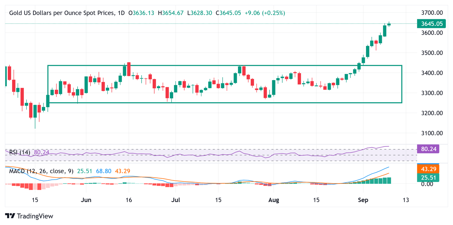 Gold (XAU/USD) enters a bullish consolidation phase during the European session and remains close to a fresh all-time peak, around the $3,659-3,660 region touched earlier this Tuesday. A generally positive tone around the global equity markets turns out to be a key factor holding back traders from placing fresh bullish bets around the safe-haven commodity amid overbought conditions on short-term charts. The downside, however, remains cushioned amid the prevalent US Dollar (USD) selling bias.