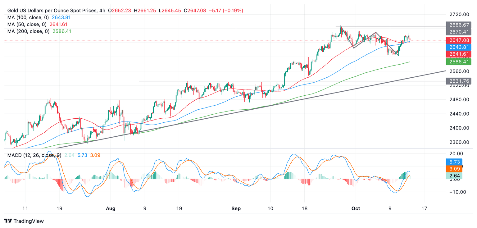 It reached a resistance level at around $2,670 from a row of previous highs including the October 1 and 4 highs (dashed line) and corrected back. A close above would probably lead to a continuation up to the $2,685 all-time high.