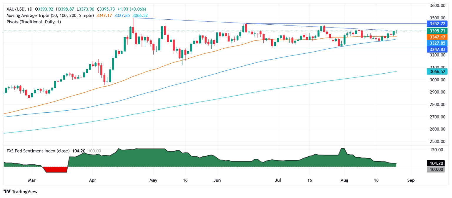 - XAU/USD trades around $3,397 as traders price in 90% chance of September Fed rate cut.