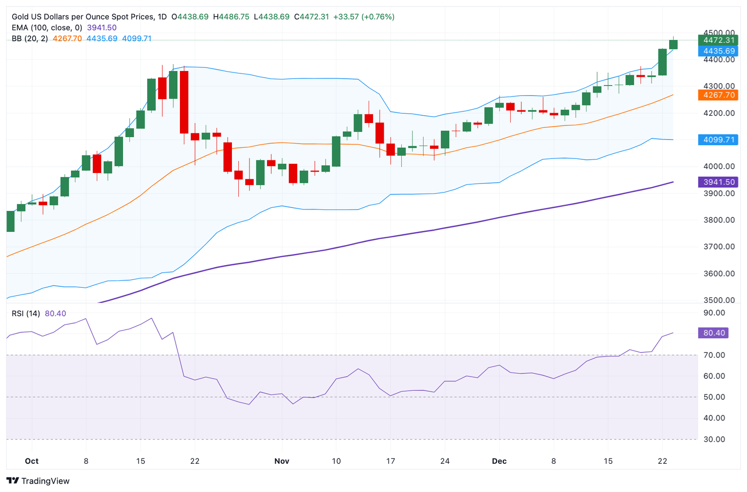 Additionally, expectations that the US Federal Reserve (Fed) will cut interest rates further next year could also support the yellow metal. Lower interest rates could reduce the opportunity cost of holding Gold, supporting the non-yielding precious metal. The market is pricing in multiple Fed interest rate cuts in 2026 amid signs of easing inflation and sluggish jobs growth.
