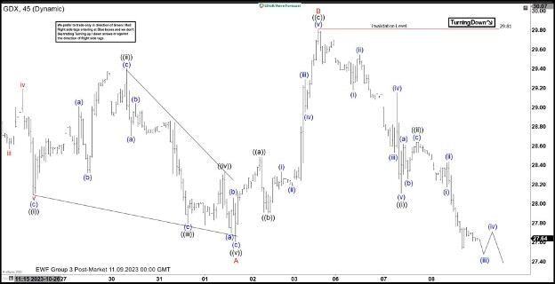 Short term Elliott Wave view in Gold Miners ETF (GDX) suggests the ETF is correcting cycle from 10.4.2023 low. Rally from 10.4.2023 low ended wave (1) at 30.16. Pullback in wave (2) is unfolding as a zigzag Elliott Wave structure. Down from wave (1), wave A ended at 27.61 as a diagonal. Rally in wave B ended at 29.81 as another zigzag in lesser degree. Up from wave A, wave ((a)) ended at 28.48 and dips in wave ((b)) ended at 27.90 Final leg wave ((c)) ended at 29.81 which completed wave B.
