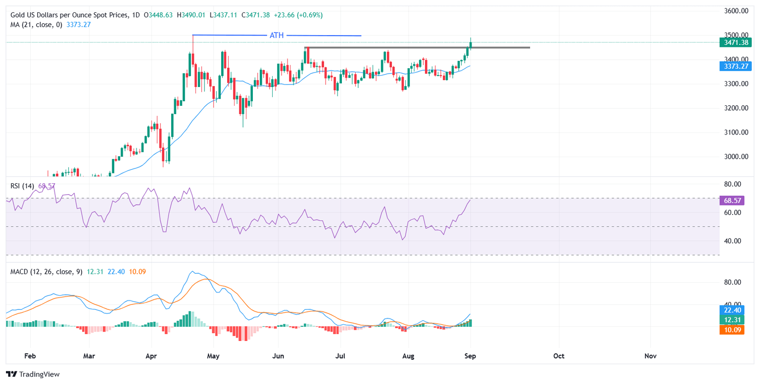 At the time of writing, XAU/USD is consolidating around $3,475 in the American session, after marking an intraday high of $3,490 during Asian hours— just shy of the all-time peak at $3,500. Mild technical selling and steady US Treasury yields are weighing on sentiment, while trading conditions remain thin with United States (US) markets closed for Labor Day.