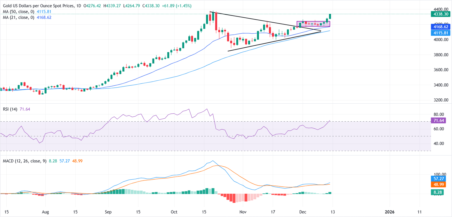 Gold (XAU/USD) extends its advance on Friday as expectations build for further monetary policy easing by the Federal Reserve (Fed) after this week’s interest rate cut. At the time of writing, XAU/USD is trading around $4,337, just shy of its all-time high near $4,381, marked on October 20.