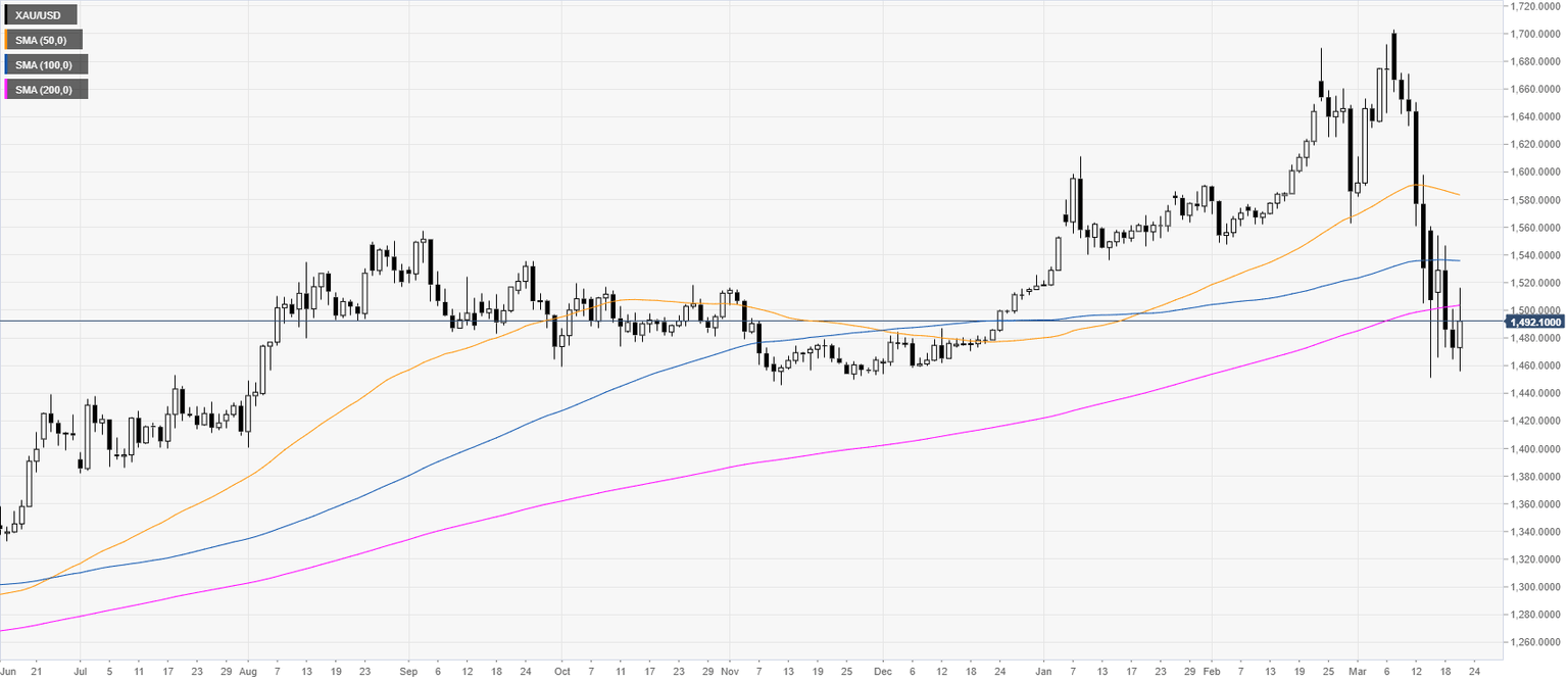 Last week, XAU/USD recorded its worst weekly decline since 1983, erasing the early 2020 bull-run while now challenging the 200 DMA (daily simple moving average) on the daily chart. XAU/USD keeps consolidating losses below $1500 per troy ounce.