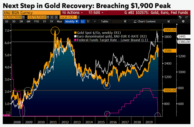 It was the cut to zero interest rates by the Federal Reserve in December 2008 that accelerated the gold bull market to the 2011 peak. Covid-19 is a worthy catalyst to buoy gold toward its highs. That fact that the metal has reached records in most currencies leads us to expect that a similar result for dollar-denominated gold is only a matter of time.