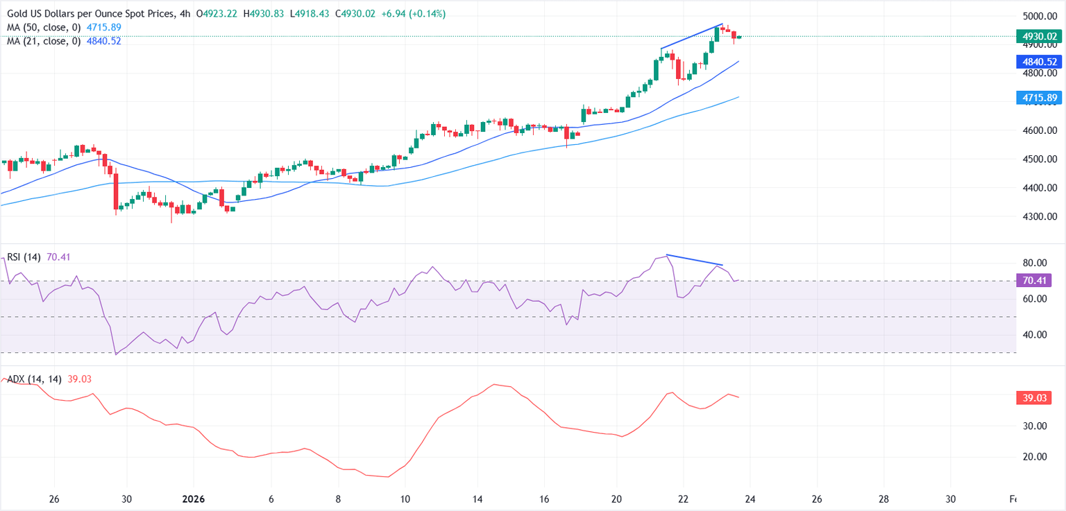 Gold (XAU/USD) eases modestly on Friday as mild profit-taking sets in following a surge to a fresh record high near $4,967 earlier in the Asian session. XAU/USD hovers around $4,930 at the time of writing and is set for a third straight weekly advance.