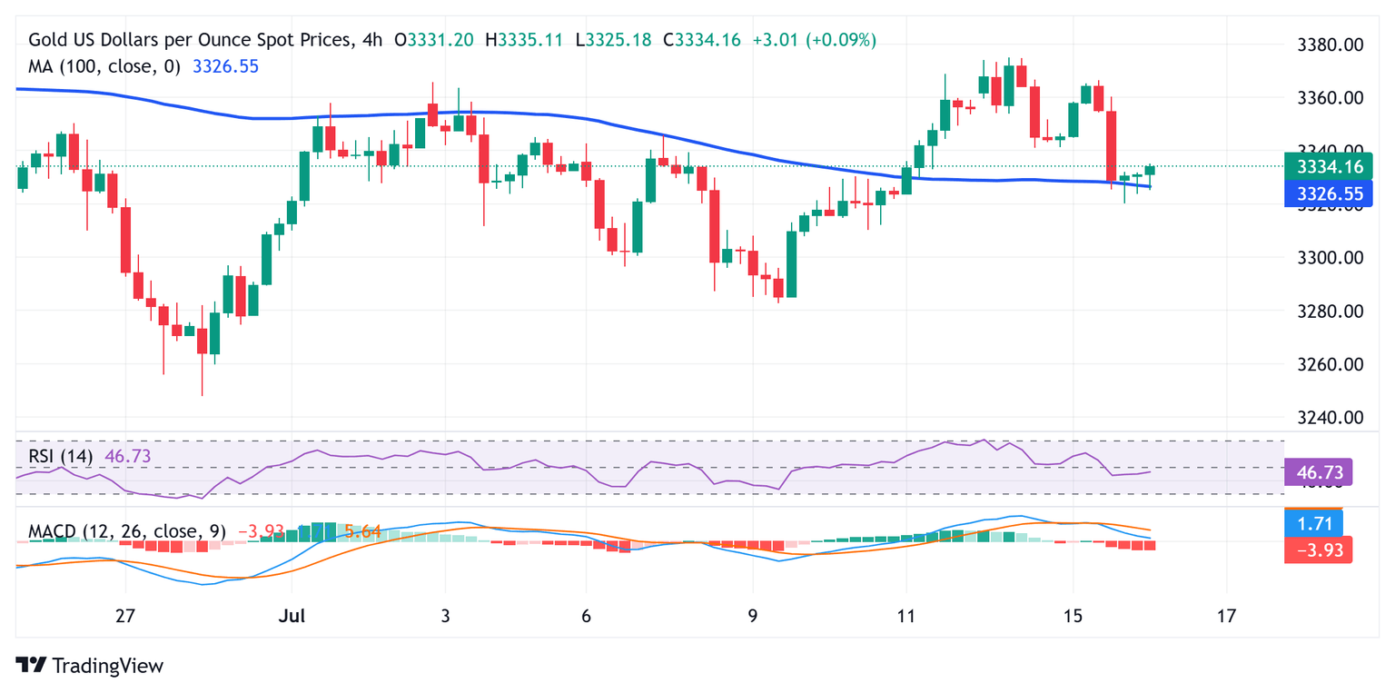 Gold price (XAU/USD) sticks to intraday gains through the first half of the European session, albeit it lacks follow-through and remains below the $3,350 level. Investors remain worried about the potential economic fallout from US President Donald Trump's trade tariffs. This, along with a modest US Dollar (USD) pullback from its highest level since June 23, touched on Tuesday, turns out to be a key factor lending some support to the commodity.
