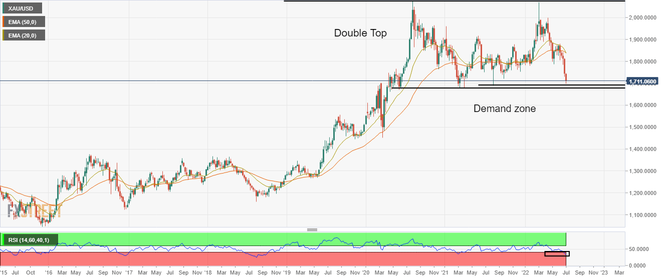 Gold prices are declining towards the demand zone, which is placed in a narrow range of $1,680.67-1,687.68 on the weekly scale. The sheer downside move on Thursday was expected to drag the precious metal further, however, the gold prices remained shy of the potential demand zone. The bright metal shifted into the bearish trajectory after failing to overstep the all-time highs at $2,075.32 and formed a textbook-copied Double Top.