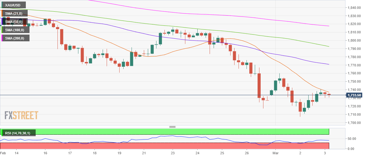 From a short-term technical perspective, the bearish 21-simple moving average (SMA) at $1736 on the four-hour chart is capping the recovery attempts, at the moment.