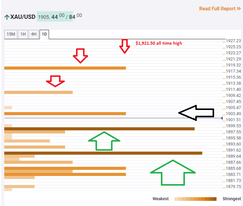 The Technical Confluences Indicator is still battling the $1,903 level, which is where the Pivot Point one-day Resistance 1 hits the price.