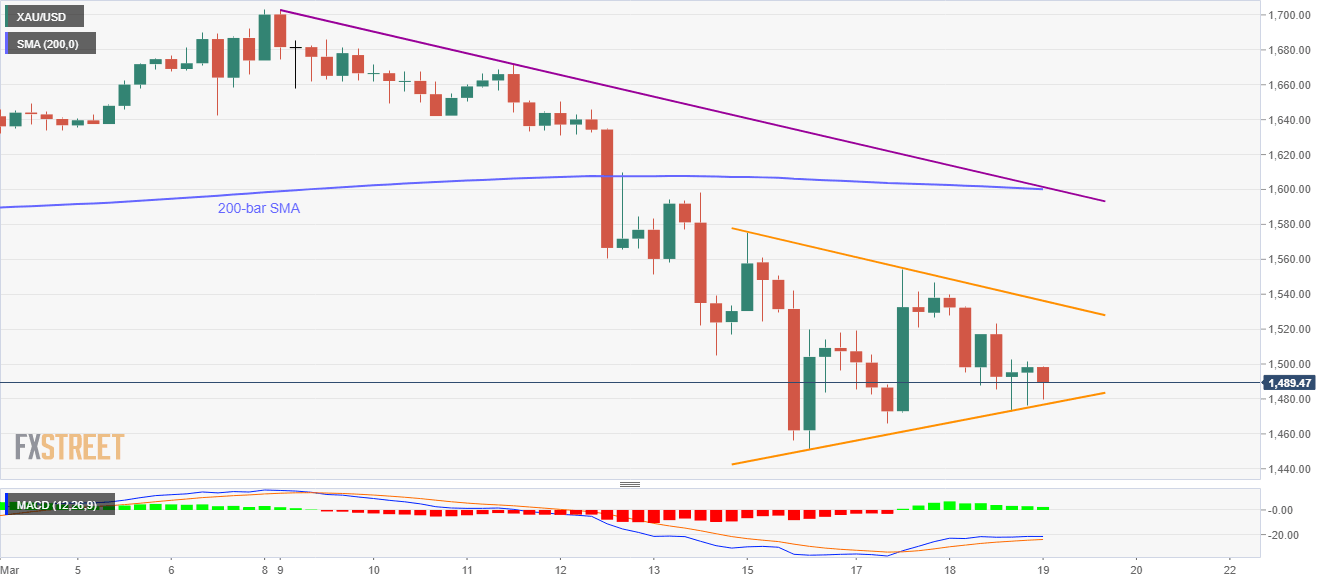 Gold prices remain on the back foot while declining to $1,484 amid Thursday’s Asian session. Even so, the weekly symmetrical triangle restricts the bullion’s moves off-late.