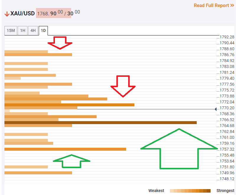 The Technical Confluences Indicator is showing that XAU/USD has strong support at $1,765, which is the convergence of the previous 4h-low, the previous monthly high, and the Fibonacci 38.2% one-week.