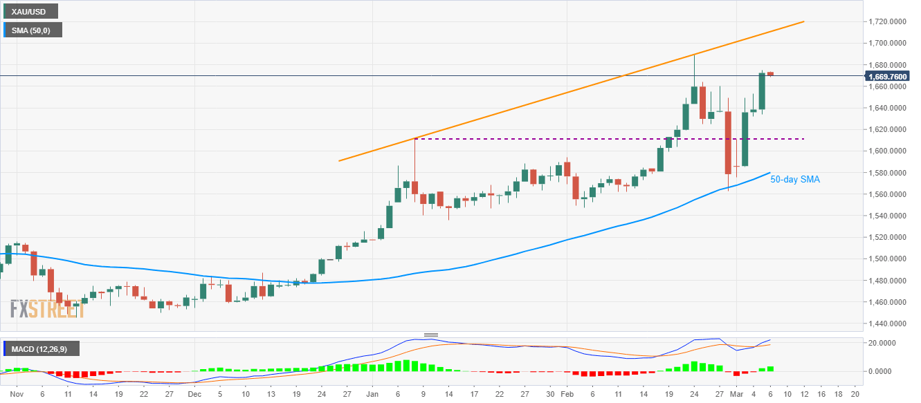 Despite witnessing a pullback from the nine-day high flashed during Thursday, Gold buyers remain hopeful as the bullion nears the record high amid bullish MACD. The yellow metal takes rounds to $1,669.76, down 0.16%, at the start of the Asian session on Friday.