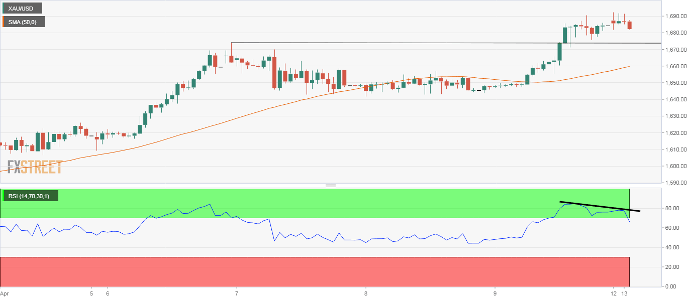 The bearish divergence is widely considered an early sign of bearish reversal and would gain credence if the immediate horizontal support at $1,678 is breached. That would expose the 50-hour average, currently at $1,660.