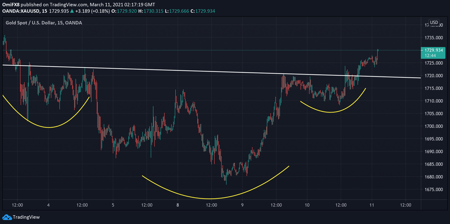 The metal's 15-minute chart shows an inverse head-and-shoulders breakout, a bullish reversal pattern. The breakout has opened the doors for a rally to $1,764 – the target as per the measured move method.