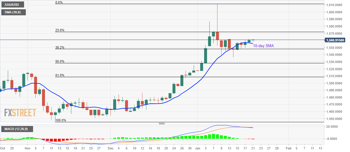 Following its sustained bounce off 10-day SMA, Gold prices seesaw near $1,560/61 during Tuesday’s Asian session.