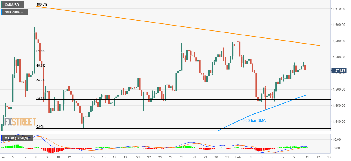 Gold prices decline to the intra-day low of $1,570.35 by the press time of early Tuesday. While repeated failures to hold the break of 50% Fibonacci retracement of early-January portrays the bullion’s weakness, bullish MACD and sustained trading above 200-bar SMA check the sellers.