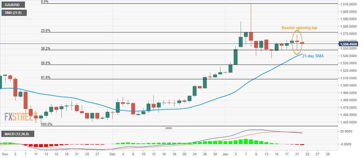 Gold remains on the back foot while trading around $1,556.90 during the Asian session on Wednesday. The yellow metal portrayed a bearish candlestick formation, backed by bearish MACD, during the previous day.