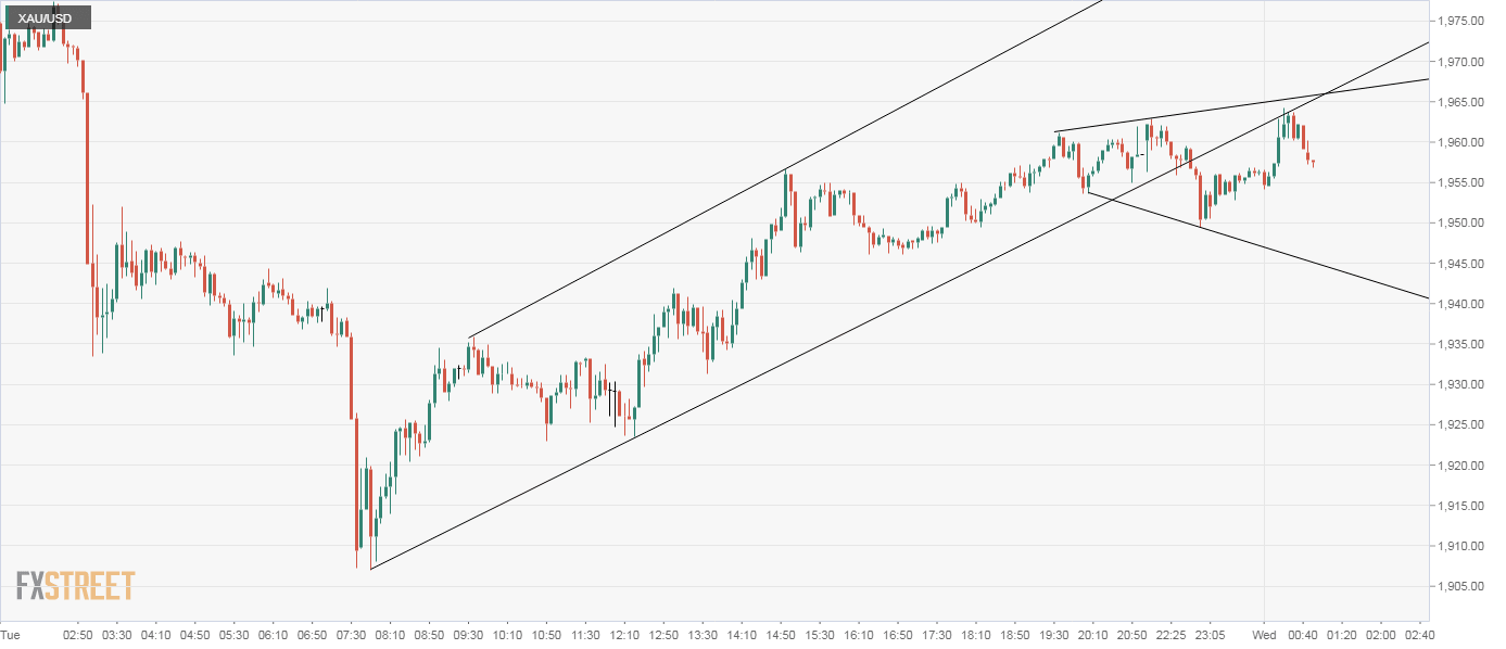 Gold has carved out a broadening sideways channel on the 5-minute chart. At press time, the yellow metal is trading largely unchanged on the day near $1,957 per ounce.