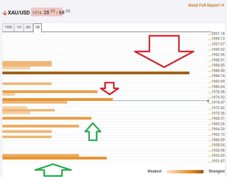 The Technical Confluences Indicator is showing that gold is initially capped at $1,975, which is a cluster including the Simple Moving Average 5-15m, the SMA 10-1h, the Bollinger Band 15min-Middle, the BB 1h-Middle, and several other SMAs.