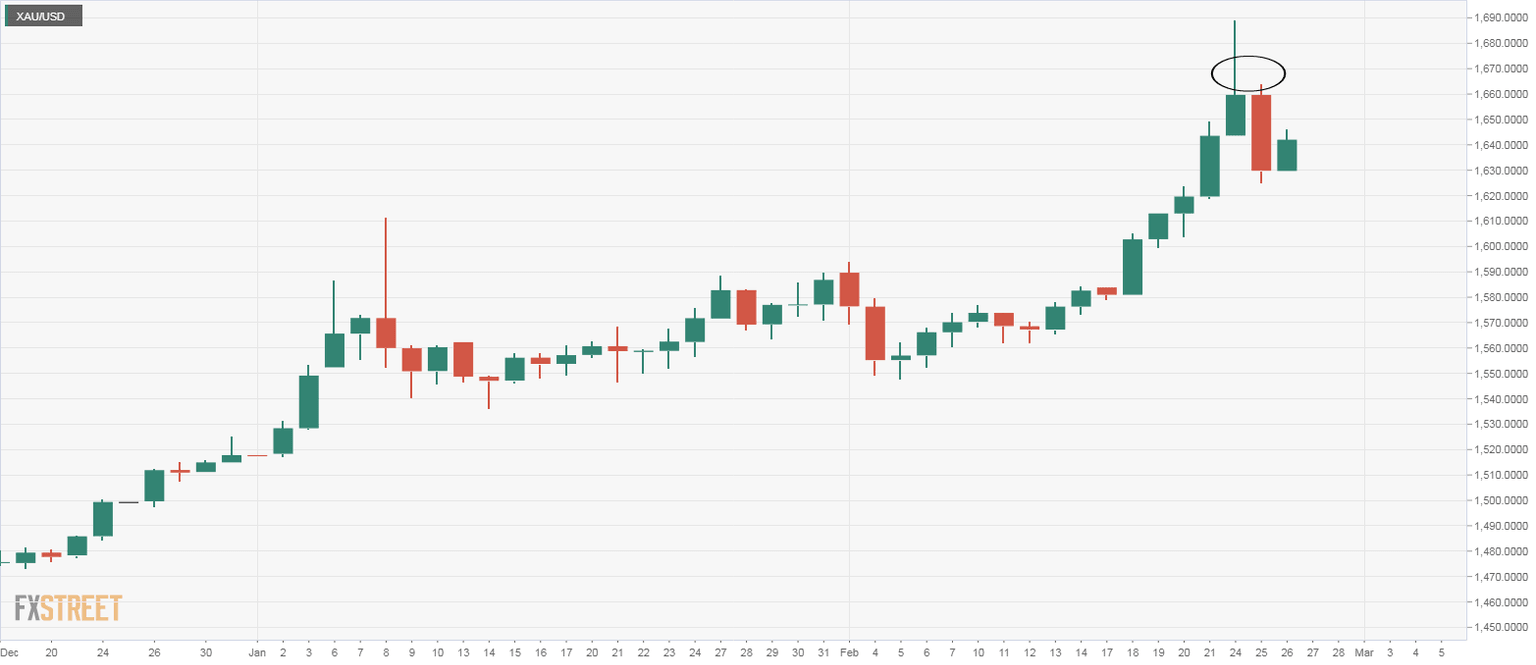 A breakout will likely remain elusive if prices find acceptance under the session low of $1,634. That would validate the bearish reversal pattern seen on the daily chart and could yield deeper declines toward $1,611 (Jan. 8 high).