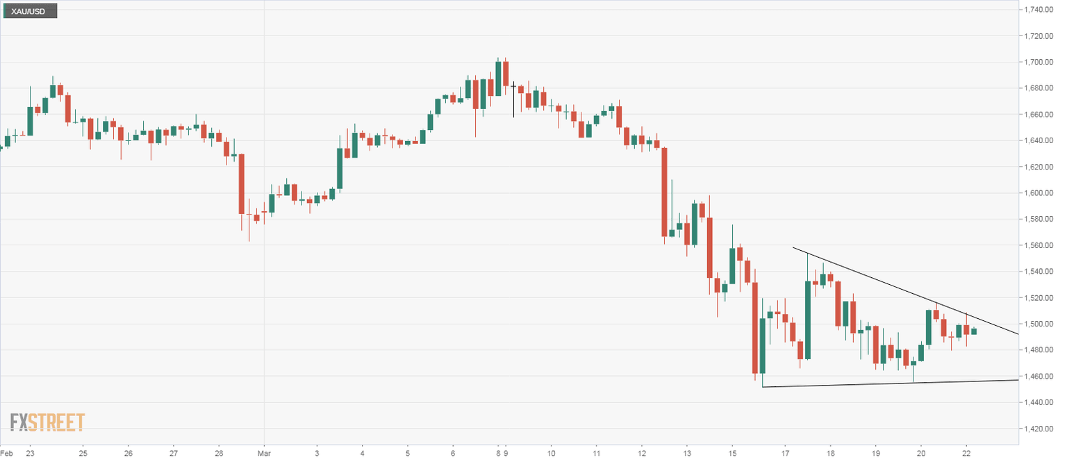Gold is struggling to shine amid fresh risk-off in the markets with prices trapped in a descending triangle pattern on the 4-hour chart.