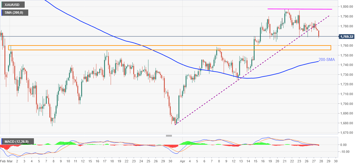 In doing so, the bright metal justifies the previous day’s downside break of an ascending support line from March 31. Also supporting the gold sellers are the bearish MACD signals.