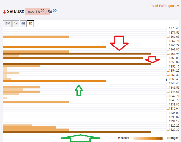 The Technical Confluences Indicator is showing that XAU/USD has some support at $1,849, which is the convergence of the Simple Moving Average 5-1h, the Fibonacci 23.6% one-day, and the previous 1h-low.