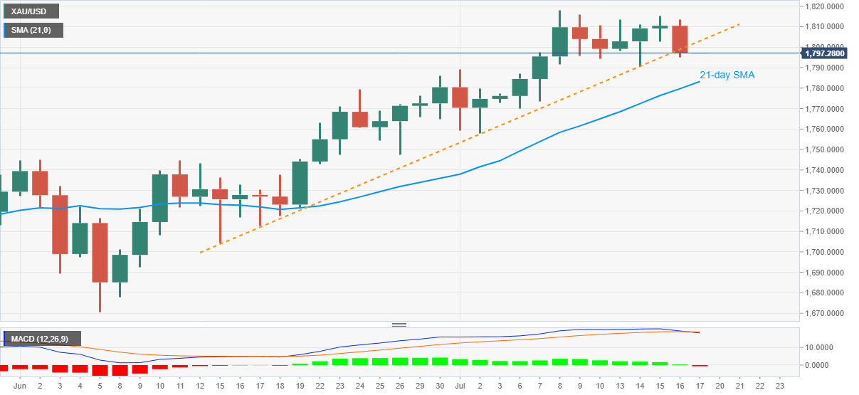 Gold remains sluggish around $1,797 amid the early Friday morning in Asia. The bullion broke an upward sloping trend line from June 15 while marking the heaviest losses since June 05 the previous day. The resulted move also drags the MACD to flash the first bearish signal in a month. However, the sellers are waiting for a confirmation of the latest weakness near a few more short-term key supports.