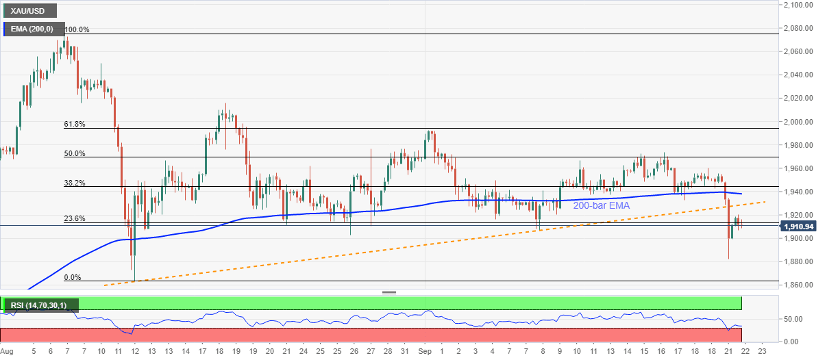 Gold remains mildly heavy around $1,910, down 0.11% on a day, while heading into Tuesday’s European session. The bullion slumped the most since August 19 the previous day after breaking a 1.5-month-old ascending trend line.