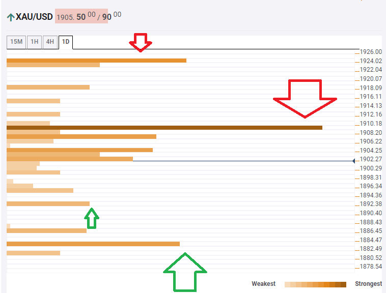 The Technical Confluences Indicator is showing that XAU/USD is capped under $1.909, which is the convergence of the Fibonacci 61.8% one-week and the Bollinger Band 4h-Middle. As the graphic below shows, it is the most robust level.
