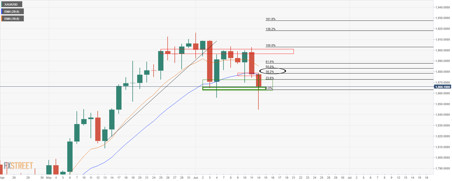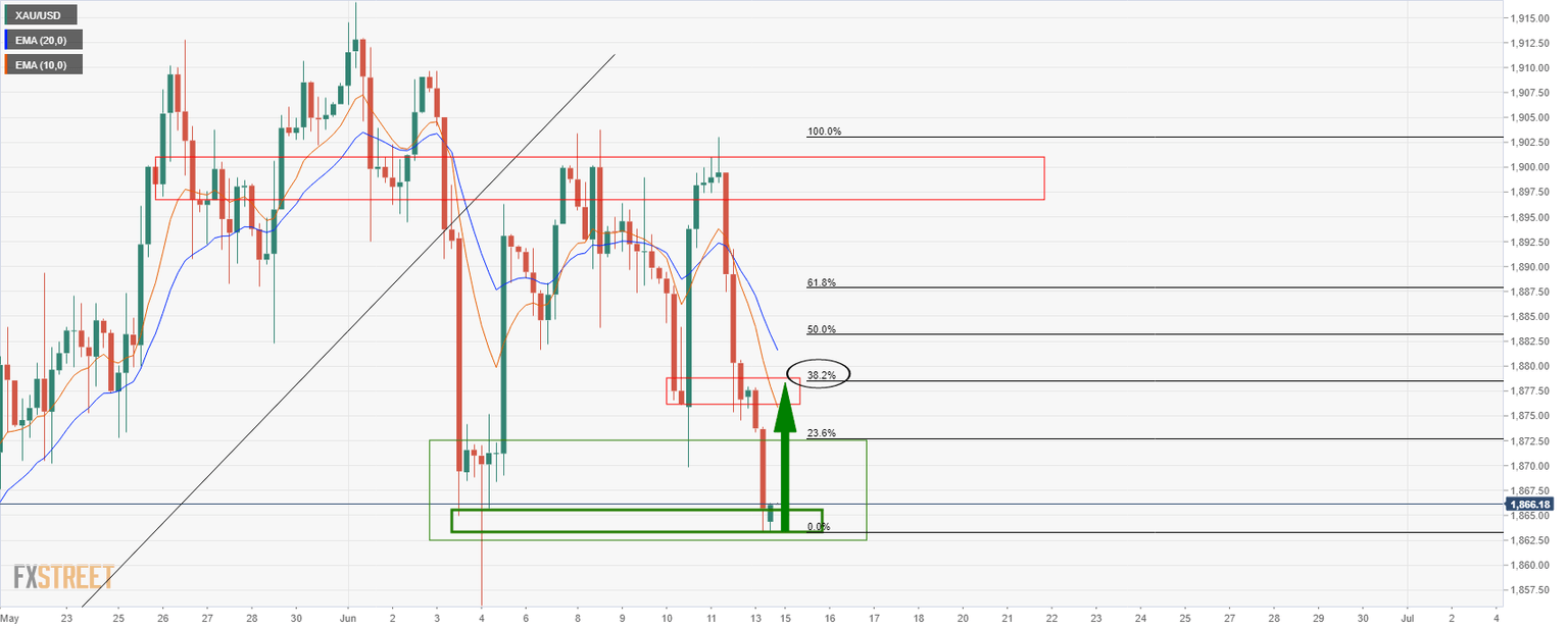 - Gold bulls have stepped in at the lows of the day pushing gold back to $1,860s.