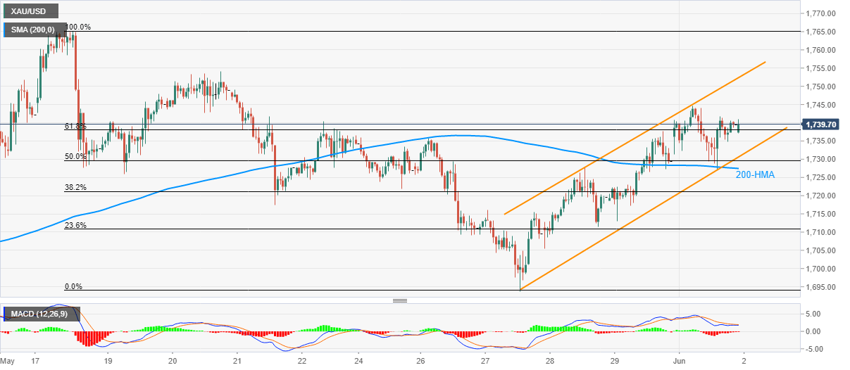 Gold prices hold onto the previous day’s gains while taking the bids near $1,740.26 during the early Asian morning on Tuesday. The yellow metal portrays a short-term bullish chart formation on the hourly chart while also being above 200-HMA.