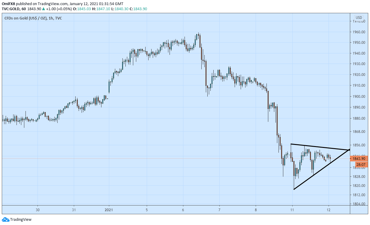 The yellow metal has carved out a pennant pattern on the hourly chart. A downside break would imply a continuation of the sell-off from $1,940 and open the doors to a re-test of Monday's low of $1,816. A violation there would expose the psychological level of $1,800.