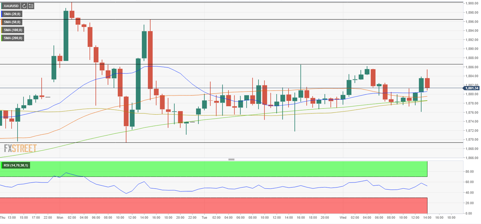 On the upside, the initial hurdle aligns at $1,886, where the price met resistance twice earlier in the day. With a break above that level, $1,896 could be seen as the next resistance ahead of $1,900 (psychological level). On the other hand, the first support is located at $1,876 (100/200-hour SMAs) before $1,870.
