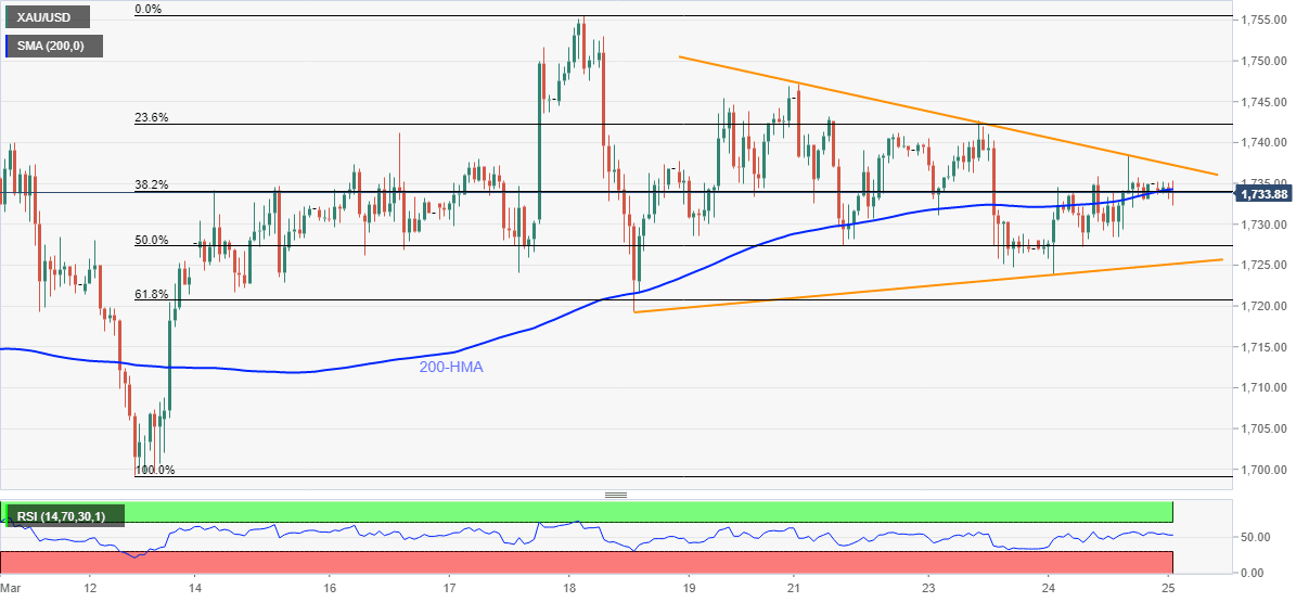 Gold prices refrain from breaking the less than $5 intraday range, bouncing off lows to around $1,735 by the press time of early Thursday. In doing so the yellow metal stays bear near 200-HMA while funneling down the one-week-old symmetrical triangle.