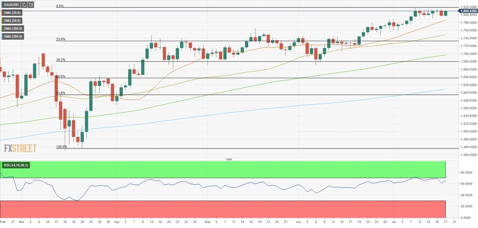 Gold Price Analysis: XAU/USD closes week above $1,800 for first time since Sep. 2011