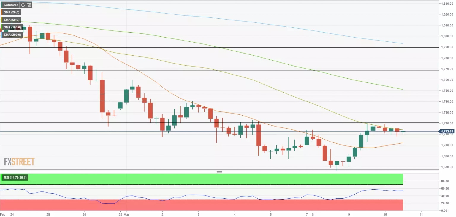 On the upside, $1,720 (Fibonacci 23.6% retracement of the February-March drop, march 9 high) aligns as a key resistance. Unless XAU/USD manages to make a daily close above that level, sellers could start dominating the pair's action. Other hurdles could be seen at $1,740 (static level) and $1,745 (Fibonacci 38.2% retracement).