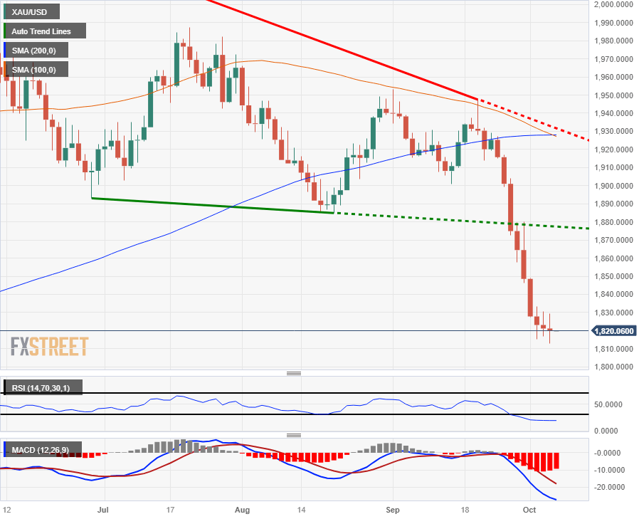 Spot Gold prices are steeply off near-term highs, trading into $1,8200 after testing a fresh seven-month low of $1,813.07 on Thursday. The XAU/USD has closed in the red for eleven of the last twelve consecutive trading days, but the pace of downside momentum has slowed this week, with Gold down a scant 0.42% from Tuesday's opening bids.