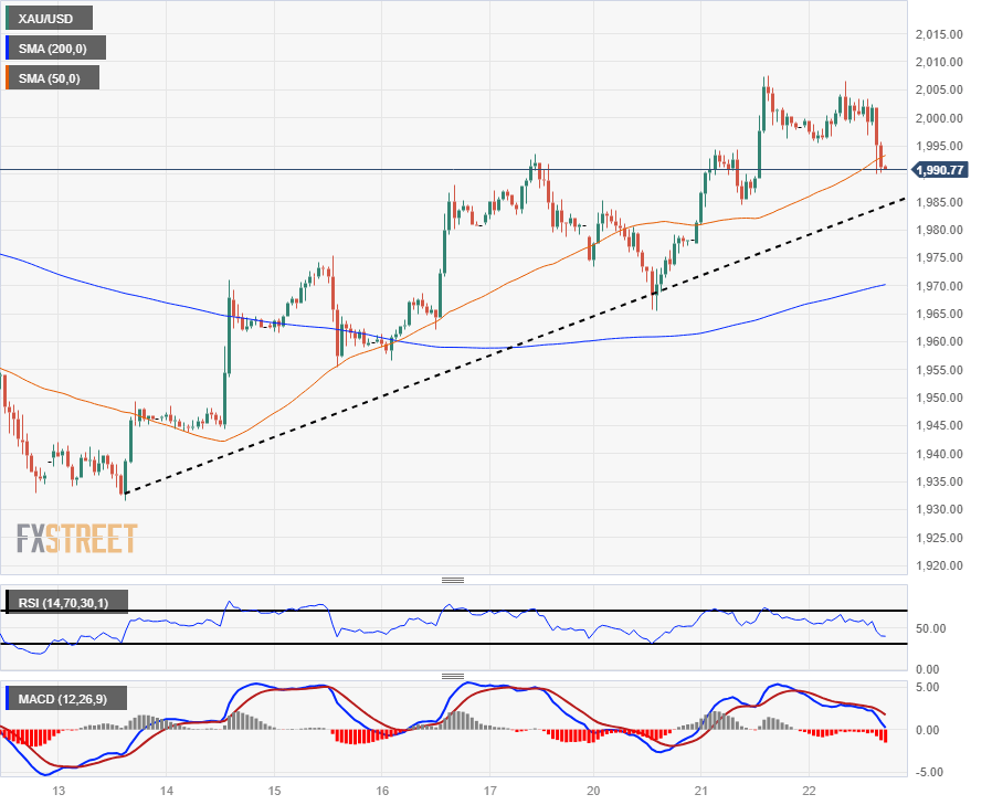Gold's snap decline in intraday Wednesday trading sees the XAU/USD slipping back from the $2,000 handle to challenge $1,990, descending into the 50-hour Simple Moving Average (SMA).